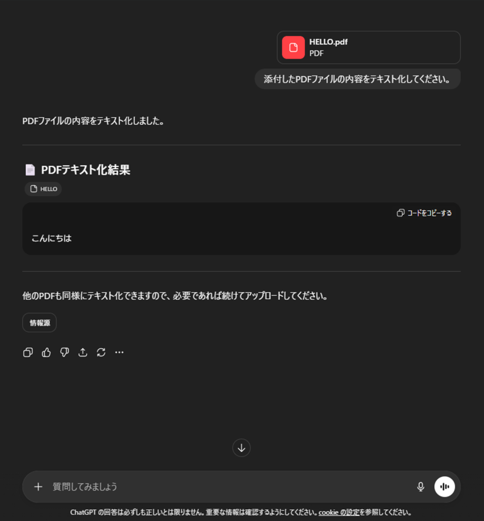 「ChatGPT」では紙媒体の資料の写真、PDFファイルなどを添付し、「内容をテキスト化してください。」と指示することで、テキストデータとして抽出することができます。
