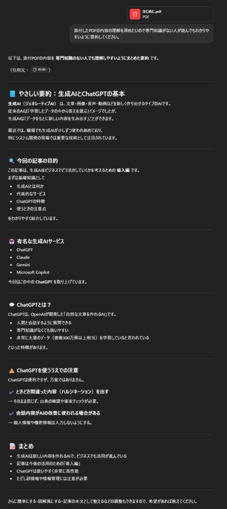 サイトのURLやPDFを添付し、「内容を要約してください。」と指示することで、要約したテキストを出力することができます。
