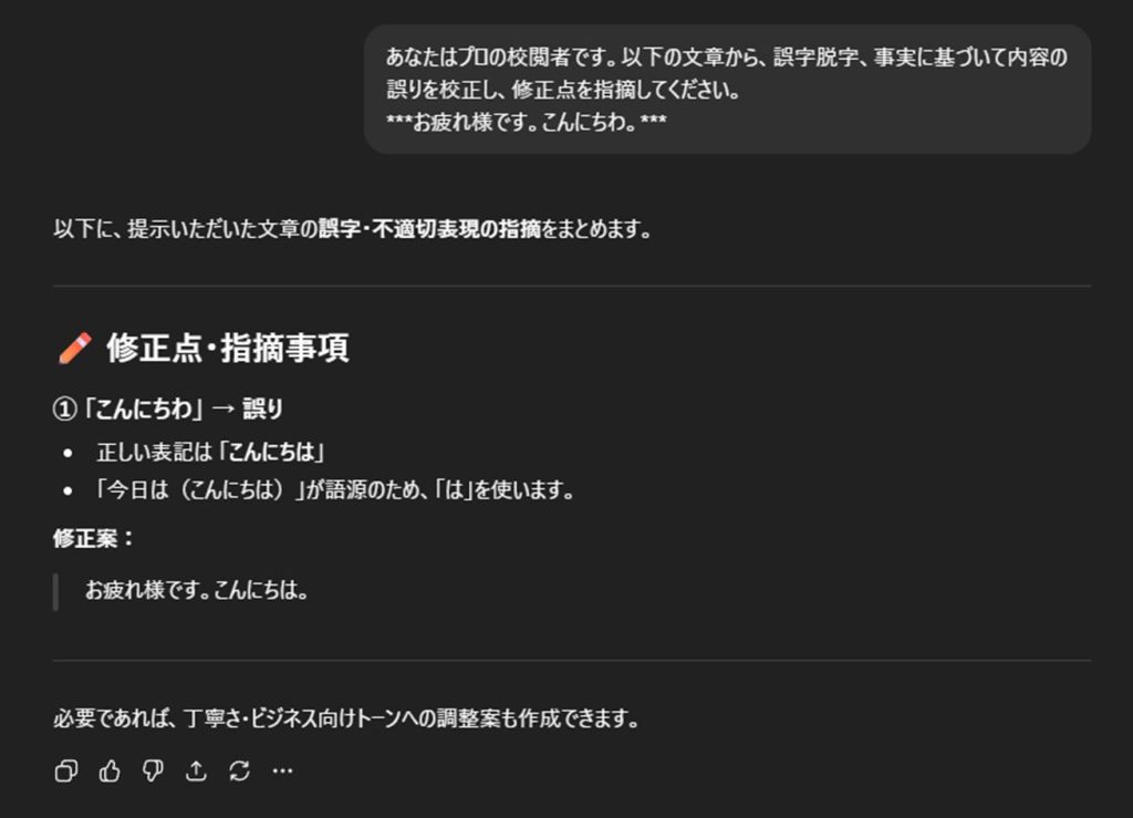 その文章とともに「あなたはプロの校閲者です。以下の文章から、誤字脱字、事実に基づいて内容の誤りを校正し、修正点を指摘してください。」