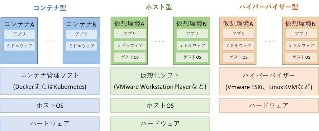 コンテナ以外にも仮想化技術があり、図にすると下記となります。