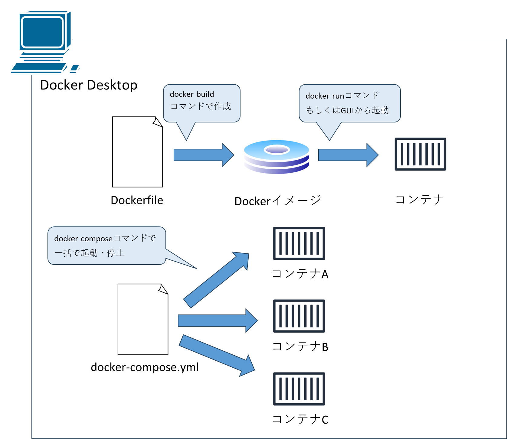 docker-compose.ymlというファイルにコンテナの構成情報を定義し、コンテナの起動・停止といった管理が一括で行えます。