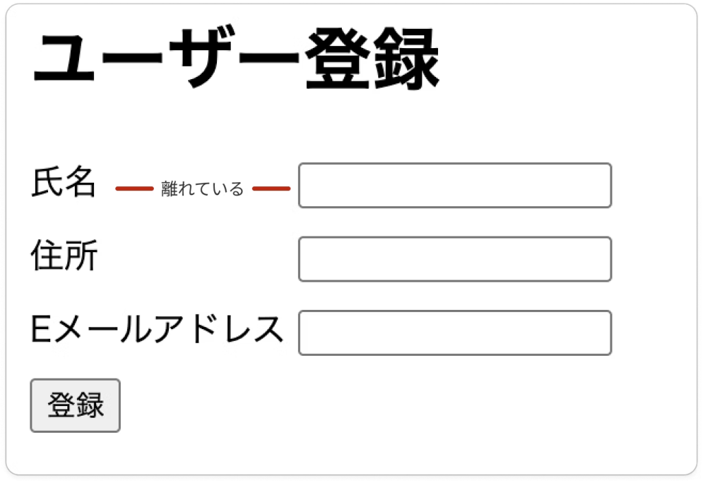 続いてパターン2のレイアウトを改めて確認します。こちらは入力欄の開始位置が揃っているため、整列の原則は満たしています。しかし、氏名と住所の項目はラベルと入力欄の位置が離れてしまっています。そのため、「近接」の原則を満たせていないことになります。