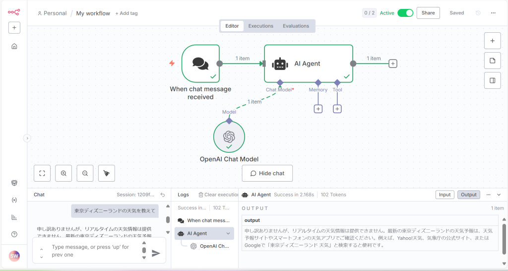 この時点でAIエージェントに「東京ディズニーランドの天気を教えて」と入力し、送信ボタンを押すと、「申し訳ありませんが、リアルタイムの天気情報は提供できません。最新の東京ディズニーランドの天気予報は、天気予報サイトやスマートフォンの天気アプリでご確認ください…」のような応答や、実際の天気とは異なる天気情報(噓の情報)が返ってきます。