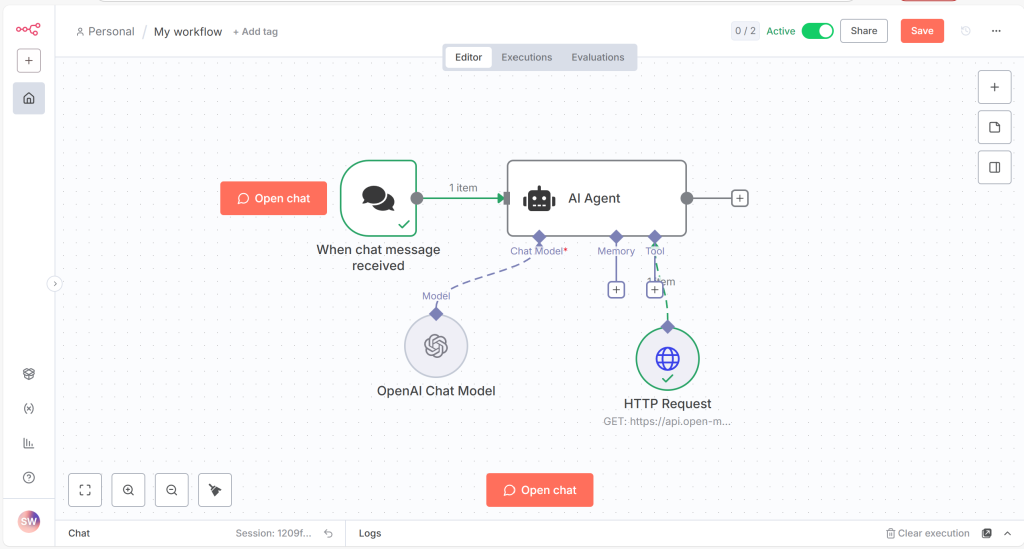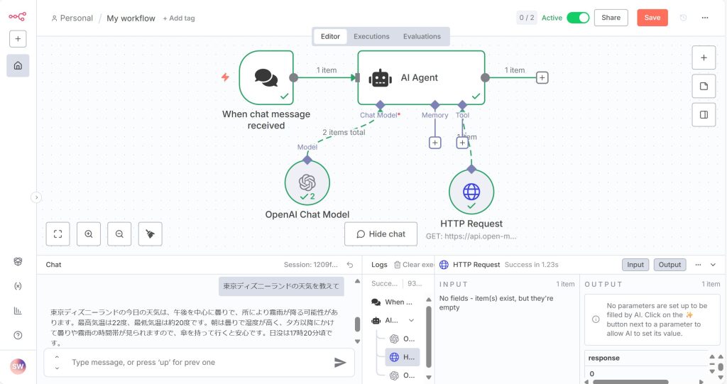 WebAPIのためAIエージェントにはHTTP Requestを接続し、天気情報URLをセットします。
