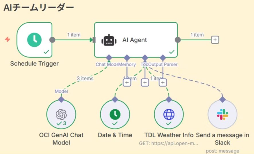 デモ内容:定期的に天気予報情報を取得し、明日の天気が良ければSlackチャンネルにディズニーランドへのお誘いメッセージを送信し、天気が悪ければ社内ハンズオンの案内を送信する、AIチームリーダーの作成をしていただきました。
