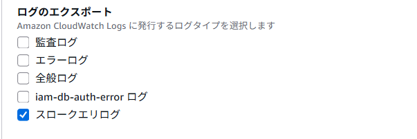インスタンスを選択して「変更」ボタンから変更画面を表示 → 「モニタリング」セクションにて、「ログのエクスポート」のスロークエリログにチェックを入れる → 適用