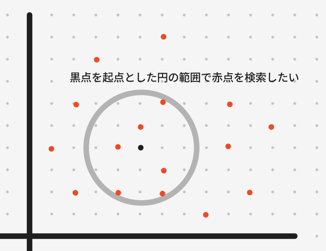 黒い点が対象のお店を表すデータとしてます。そのお店の詳細ページを表示する際に、半径数km以内で同じジャンルのお店(図でいうと赤い点)を取得するという仕様です。