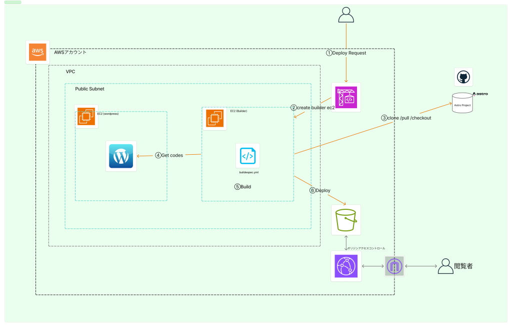 その後、CodeBuildでビルドを実行すると、Astroプロジェクトがビルドされます。この時、AstroはWordPressのAPI経由で記事を取得し、静的Webサイトを生成します。生成されたWebサイトはS3に配置し、CloudFront経由でアクセスできるようになります。